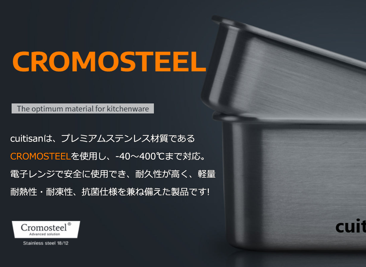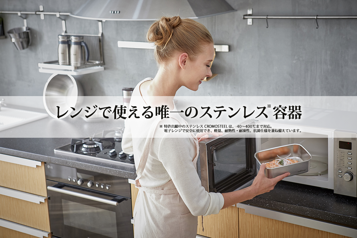 従来のステンレス製品は電子レンジで使用できませんが、Cuitisanでは特別なステンレスCromoSteelを開発採用し、電子レンジのマイクロ波の反射を低減し、電子レンジでの使用を実現しました。