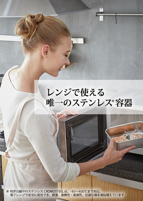 開発したCromosteel素材と独自設計により、電子レンジのマイクロ波の反射を低減。安全に電子レンジが使用できるようになりました。